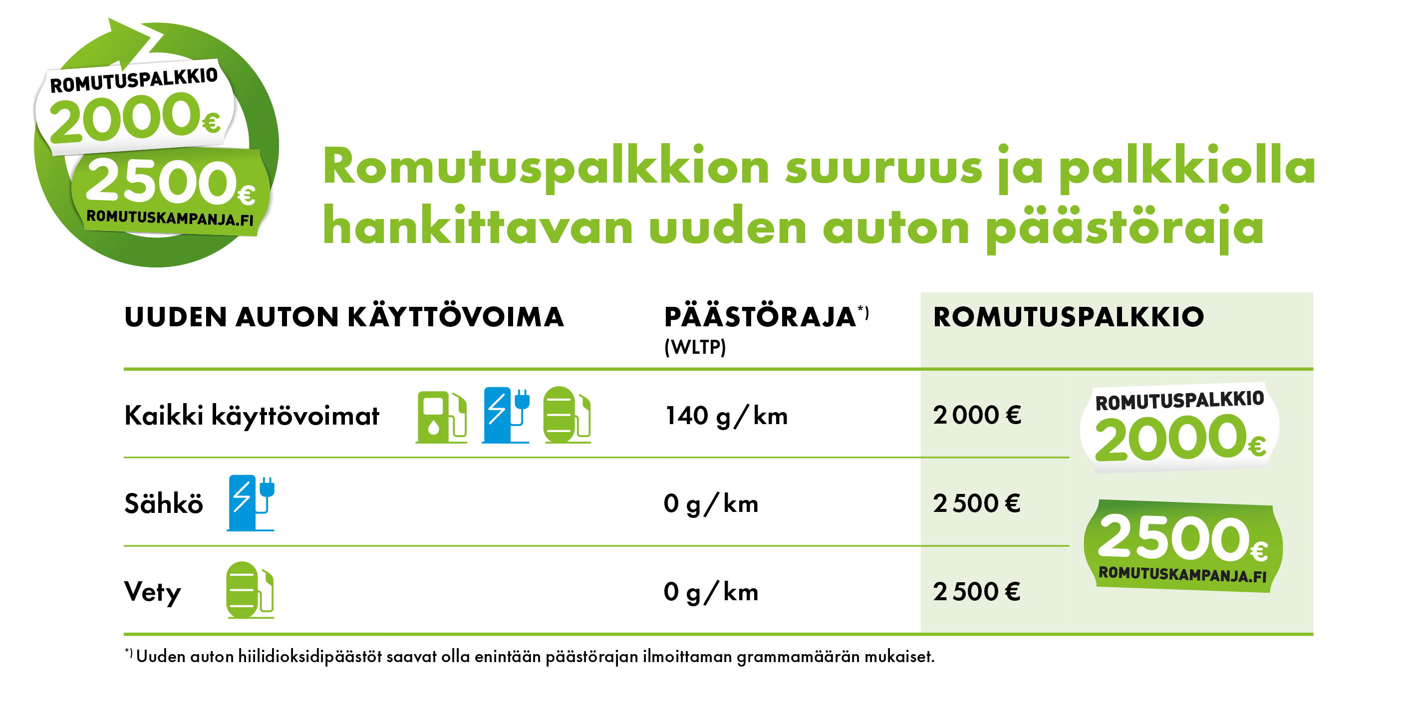 - Romutettavan auton tulee olla vähintään 10 vuotta vanha ja uuden auton hiilidioksidipäästöiltään enintään 140 g/km